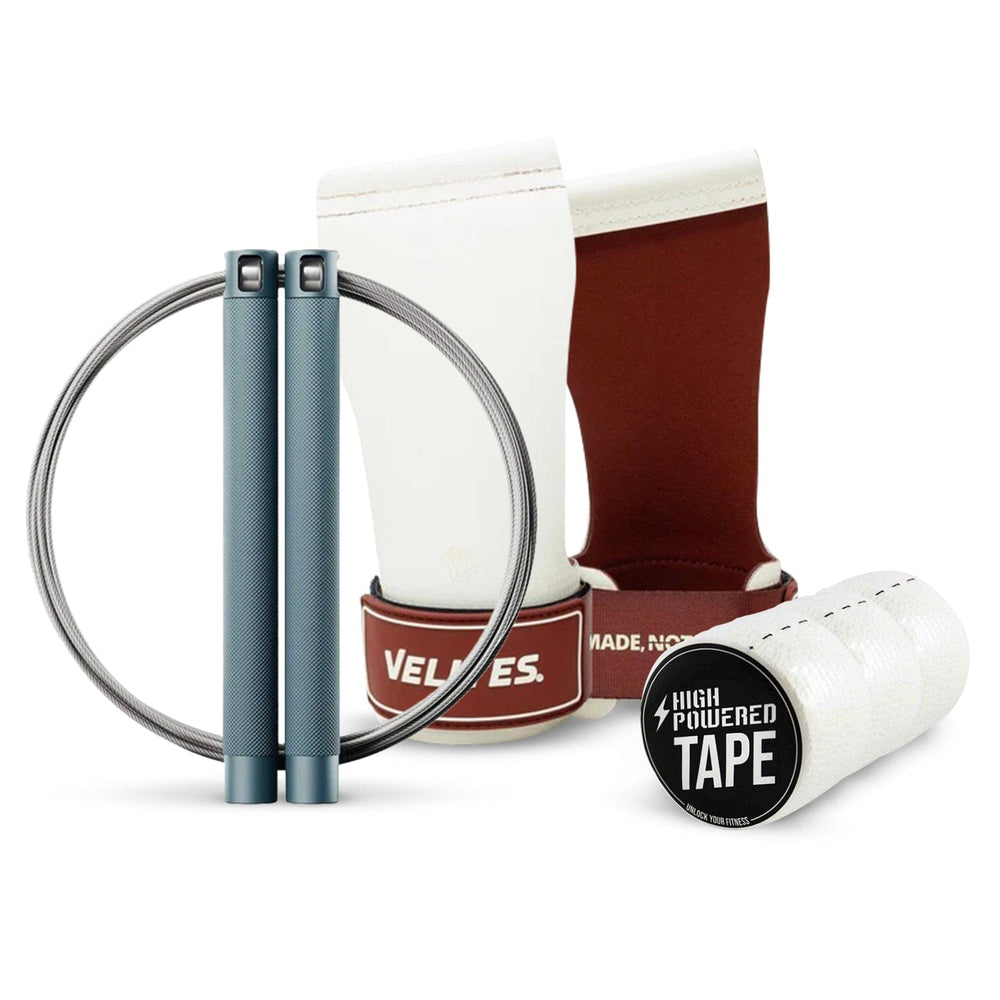 With the Velites Quad Ultra Grips, the RPM Training Session4 Speed Rope, and HighPowered Tape, you’ll experience ultimate grip, smooth hand movements, and a secure hold. There are no better products on the market. Whether you want to maximize your grip strength, perfect your jumping techniques, or protect your thumbs from wear and tear—this set offers you the best products in every category. With it, you have everything you need for your training.