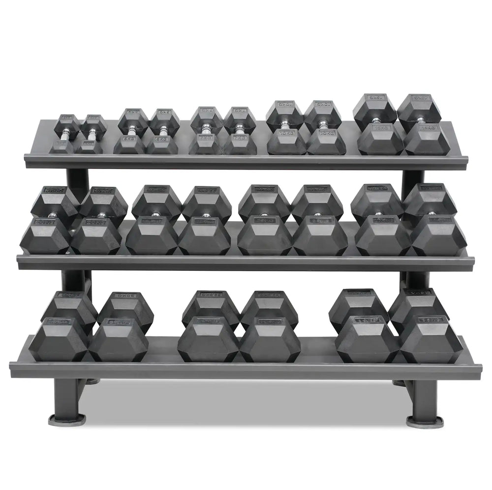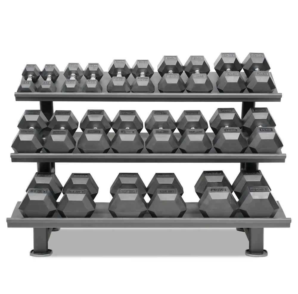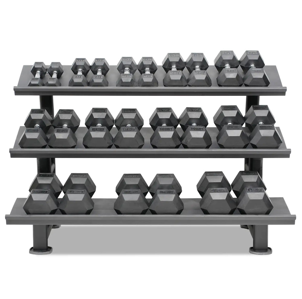 - Sturdy dumbbell rack with 3 shelves for hex dumbbells