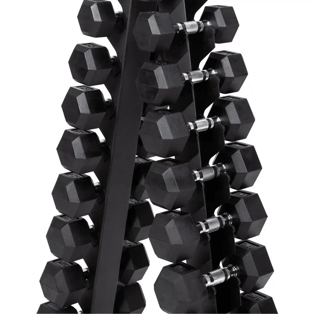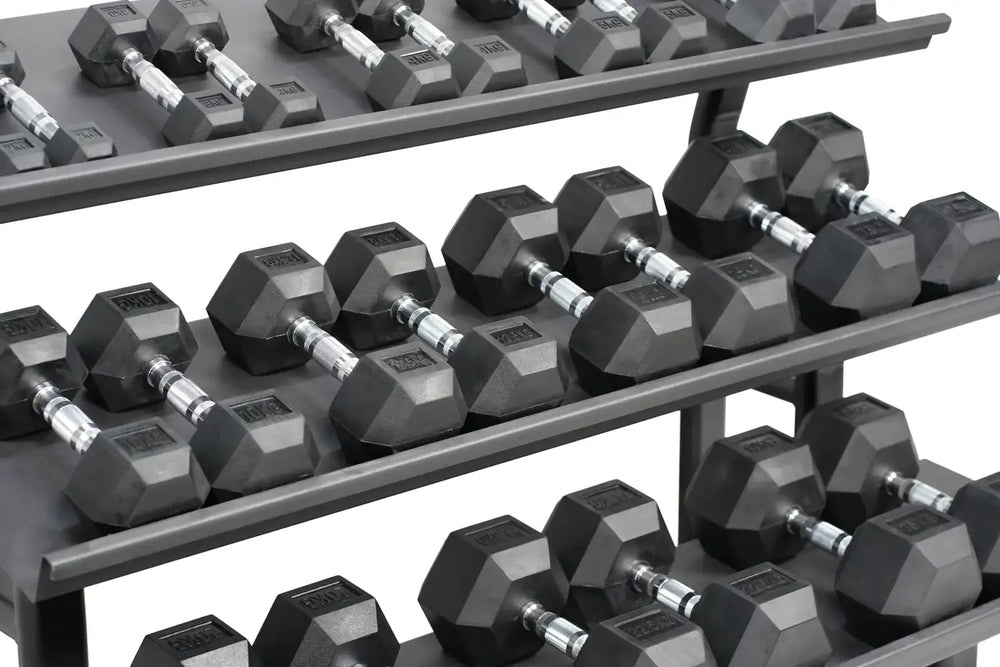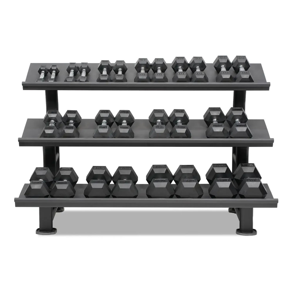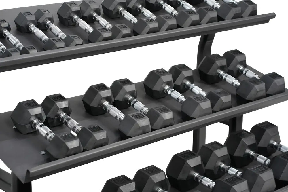 - Sturdy dumbbell rack with 3 shelves for hex dumbbells