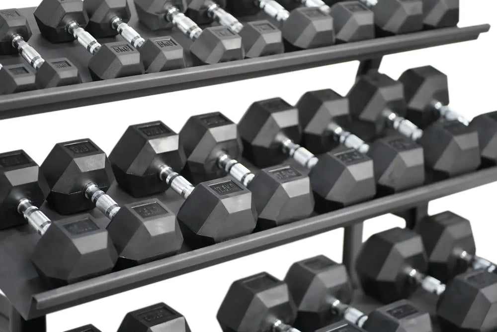 - Two sturdy dumbbell racks, each with 3 shelves for hex dumbbells