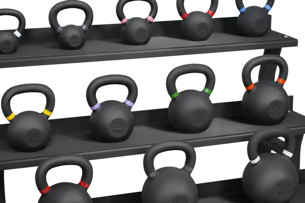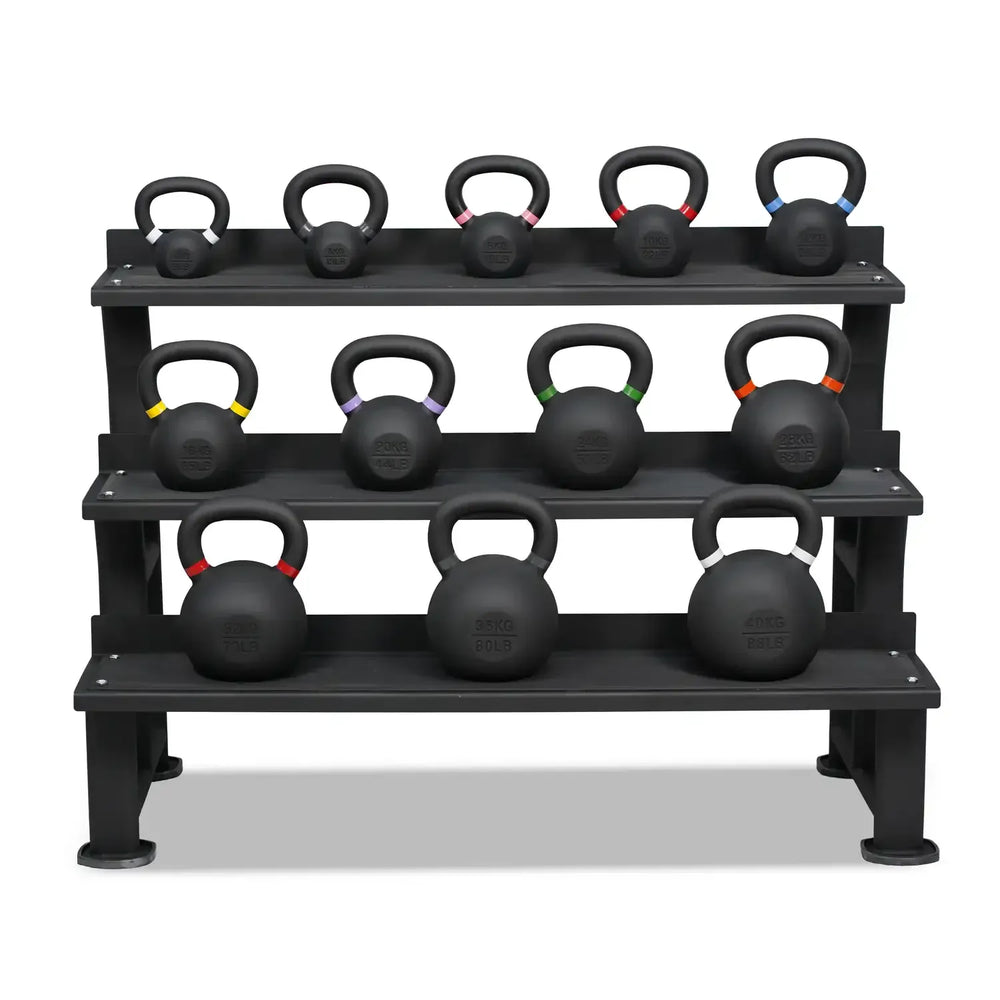 Tout en un seul endroit : ensemble complet de kettlebells avec revêtement en poudre, comprenant un support de rangement