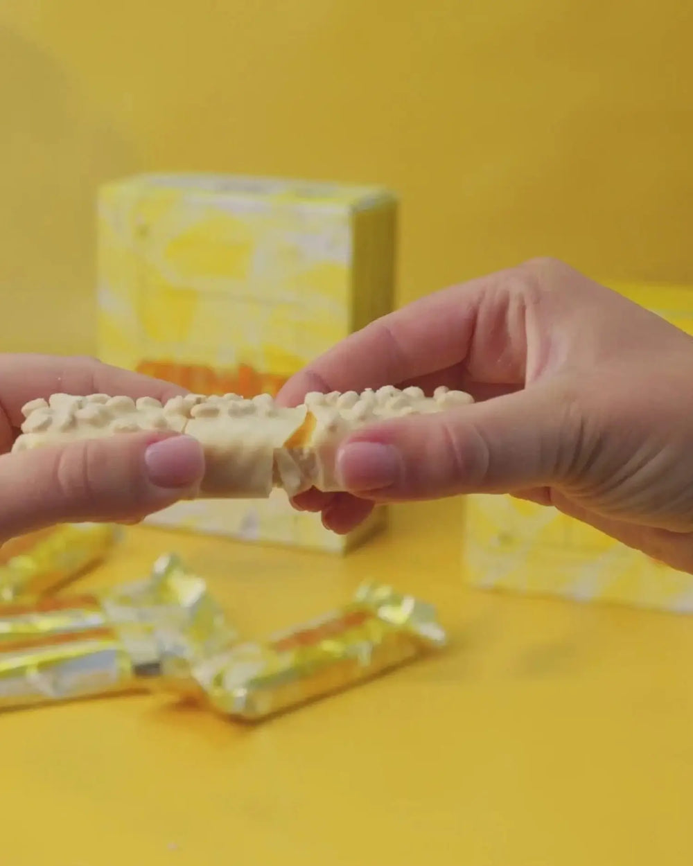 Chocolat blanc avec édulcorant (32 %) (édulcorant : maltitol ; beurre de cacao,lait entier en poudre, émulsifiant : lécithines (soja) ; arôme naturel), mélange de protéines (caséinate de calcium (lait), isolat de protéines de lactosérum (lait)), humectant : glycérol ; hydrolysat de collagène bovin, fibre alimentaire : polydextrose ; pépites de protéines de soja(isolat de protéines de soja, amidon de tapioca, sel), eau, graisse de palme, arômes, régulateur d'acidité : acide citrique ; colorant : bêta-carotène ; édulcorant : sucralose.