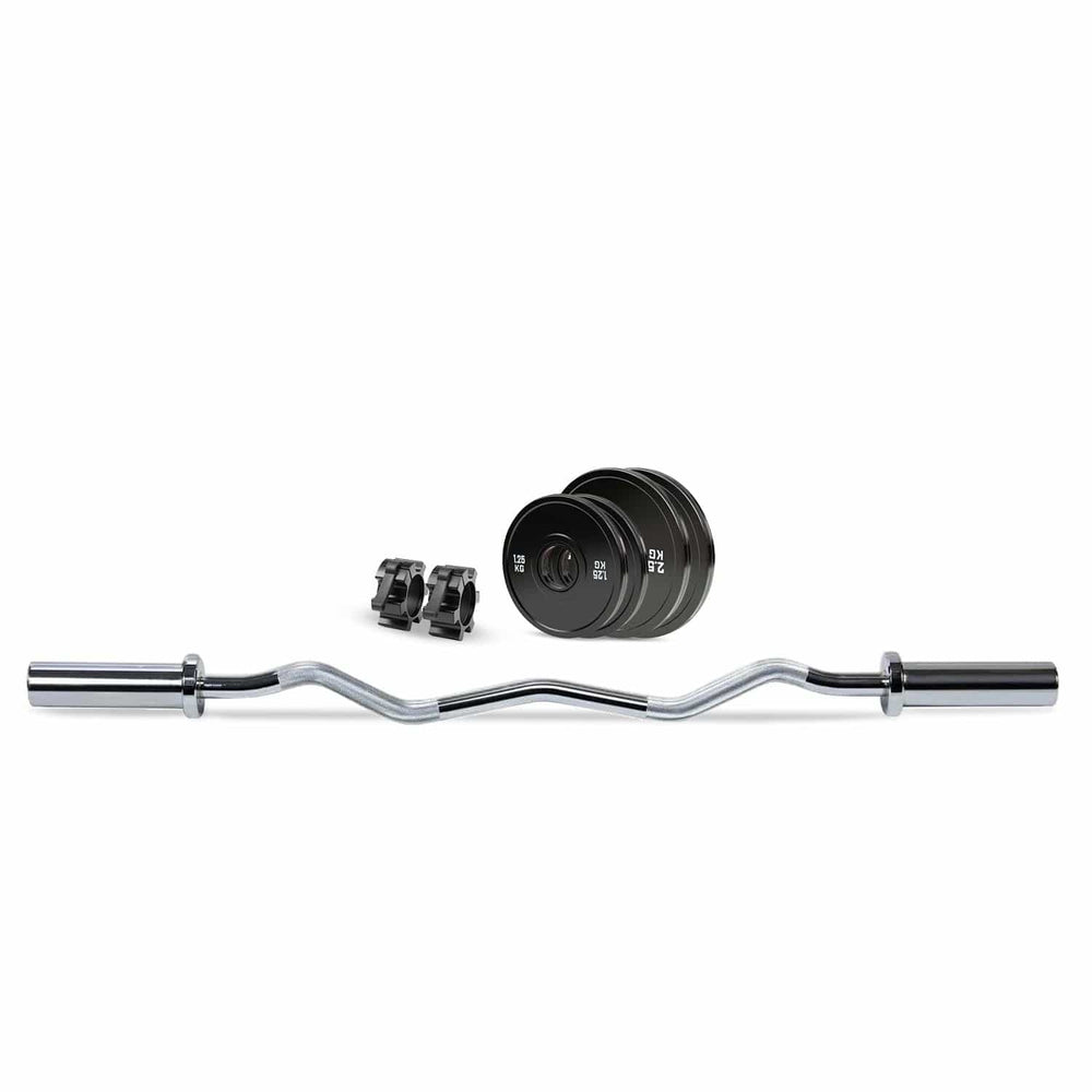 - Set besteht aus einer 8 kg SZ Curl-Stange, zwei 1.25 kg und zwei 2.5 kg Kleingewichtsscheiben, zwei 5 kg und zwei 10 kg Bumper Plates Gewichtsscheiben, sowie einem Hantelverschlusspaar (zwei Hantelverschlüsse)