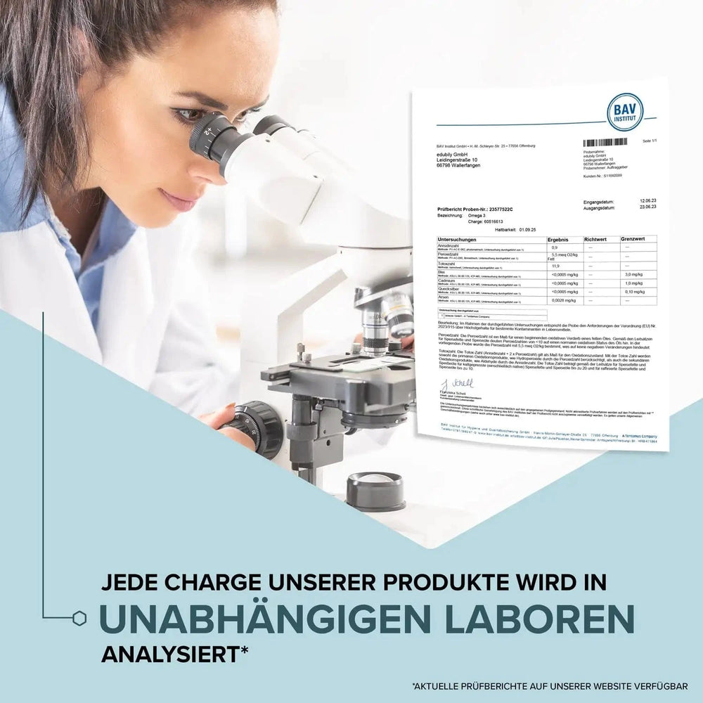 Die Omega-3-Kapseln von Edubily enthalten hochwertiges EPAX®-Fischöl, das mehrfach gereinigt wird, um Schadstoffe wie Schwermetalle und Pestizide zu entfernen. EPAX® steht für nachhaltige und innovative Omega-3-Formeln und garantiert höchste Reinheit und Qualität. Das verwendete Omega-3-Öl liegt in der besonders gut bioverfügbaren Triglycerid-Form vor und weist ein optimales 2:1-Verhältnis von EPA zu DHA auf