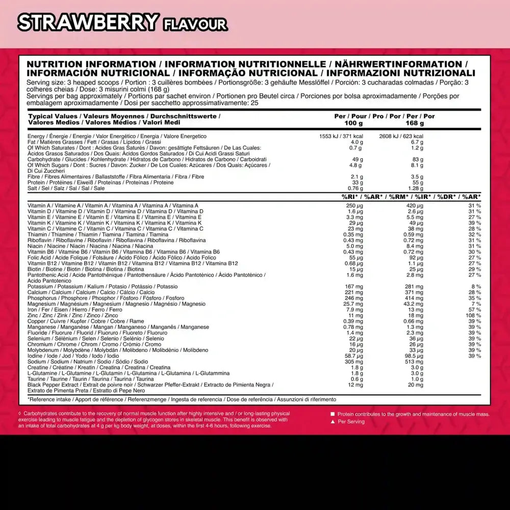 Maltodextrin, Milchproteinmischung (Molkenproteinkonzentrat, Molkenproteinisolat, mizellares Casein, Emulgator: Sojalecithin), Sojaproteinisolat, Sonnenblumenölpulver, Aromen, Kreatinmonohydrat, fettarmes Kakaopulver, L-Glutamin, Füllstoff (Polydextrose), Verdickungsmittel (Carrageen, Xanthangummi, Natriumcarboxymethylcellulose), Taurin, Mischung aus Vitaminen und Mineralstoffen (Natrium-L-Ascorbat, Eisen-Pyrophosphat, DL-Alpha-Tocopherylacetat, Nicotinamid, Zinkoxid, Retinylacetat, Calcium D-Pantothenat, Natriumfluorid, Mangansulfat, Cyanocobalamin, D-Biotin, Chrom(III)-Chlorid-Hexahydrat, Kaliumjodid, Cholecalciferol, Pteroylmonoglutaminsäure, Natrium-Selenit, Kupfercitrat, Pyridoxinhydrochlorid, Thiaminhydrochlorid, Phytomenadion, Riboflavin, Natrium-Molybdat), Natriumchlorid, Süssungsmittel (Acesulfam-K, Sucralose), L-Ascorbinsäure, Schwarzer Pfeffer-Extrakt (Piper nigrum, Frucht).