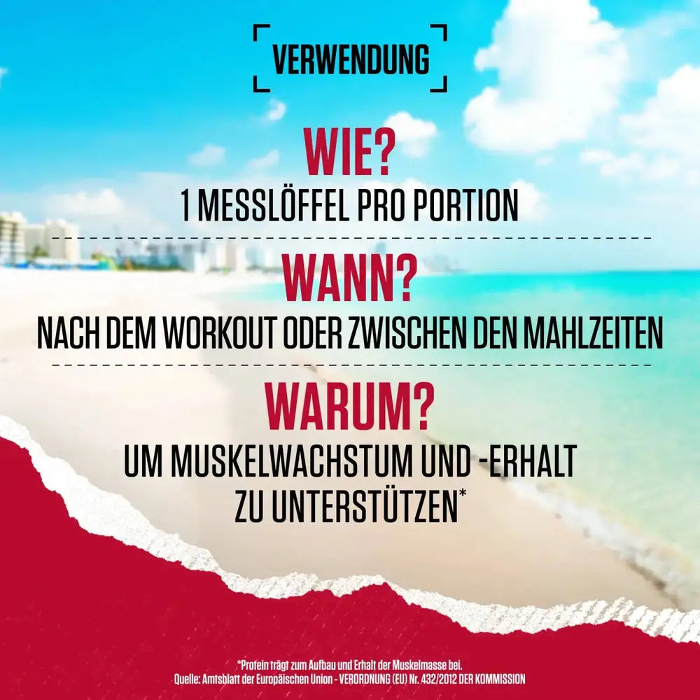 Hinweise: 3 gehäufte Messlöffel (168 g) in 600 ml kaltes Wasser mischen. Für optimale Ergebnisse eine Portion nach dem Training oder zwischen den Mahlzeiten einnehmen.