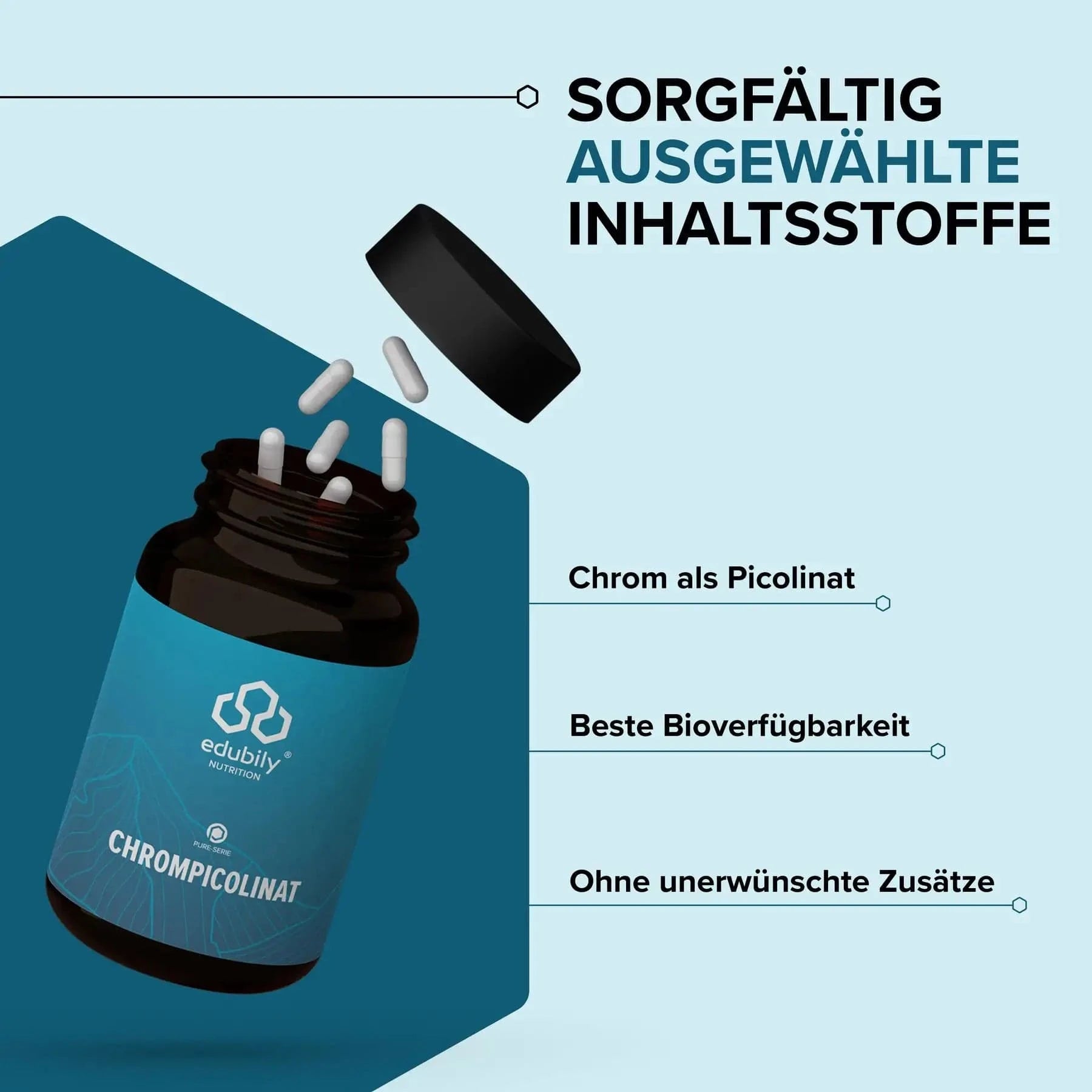 Chrom ist ein essentielles Spurenelement, das im Körper in unterschiedlichen Stoffwechselprozessen vorkommt. Edubily setzt bei ihren PURE Chrom-Kapseln auf die Form Chrompicolinat.