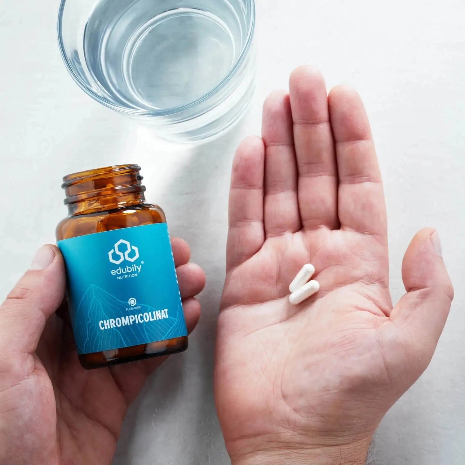 Die veganen Chrompicolinat Kapseln von Edubily liefern 60 µg Chrom pro Kapsel. Die von Fachgesellschaften empfohlenen täglichen Zufuhrmengen für Erwachsene liegt zwischen 30-100 µg. Die Kapseln gehören zu Edubilys PURE-Reihe, die sich durch eine minimalistische Rezeptur ohne unnötige Zusatzstoffe auszeichnet. In den Chrompicolinat Kapseln ist lediglich Reismehl als Füllstoff enthalten.