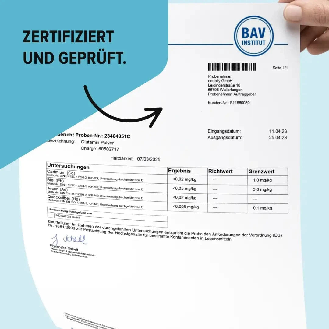 Edubily setzt auf 100% reines, veganes L-Glutamin aus pflanzlicher Fermentation – keine Glutamin-Peptide aus Weizenprotein und frei von Gluten, sowie künstlichen Zusätzen. Als Teil der PURE-Reihe steht dieses Glutamin Pulver für höchste Reinheit und lässt sich unkompliziert in Getränke einrühren.