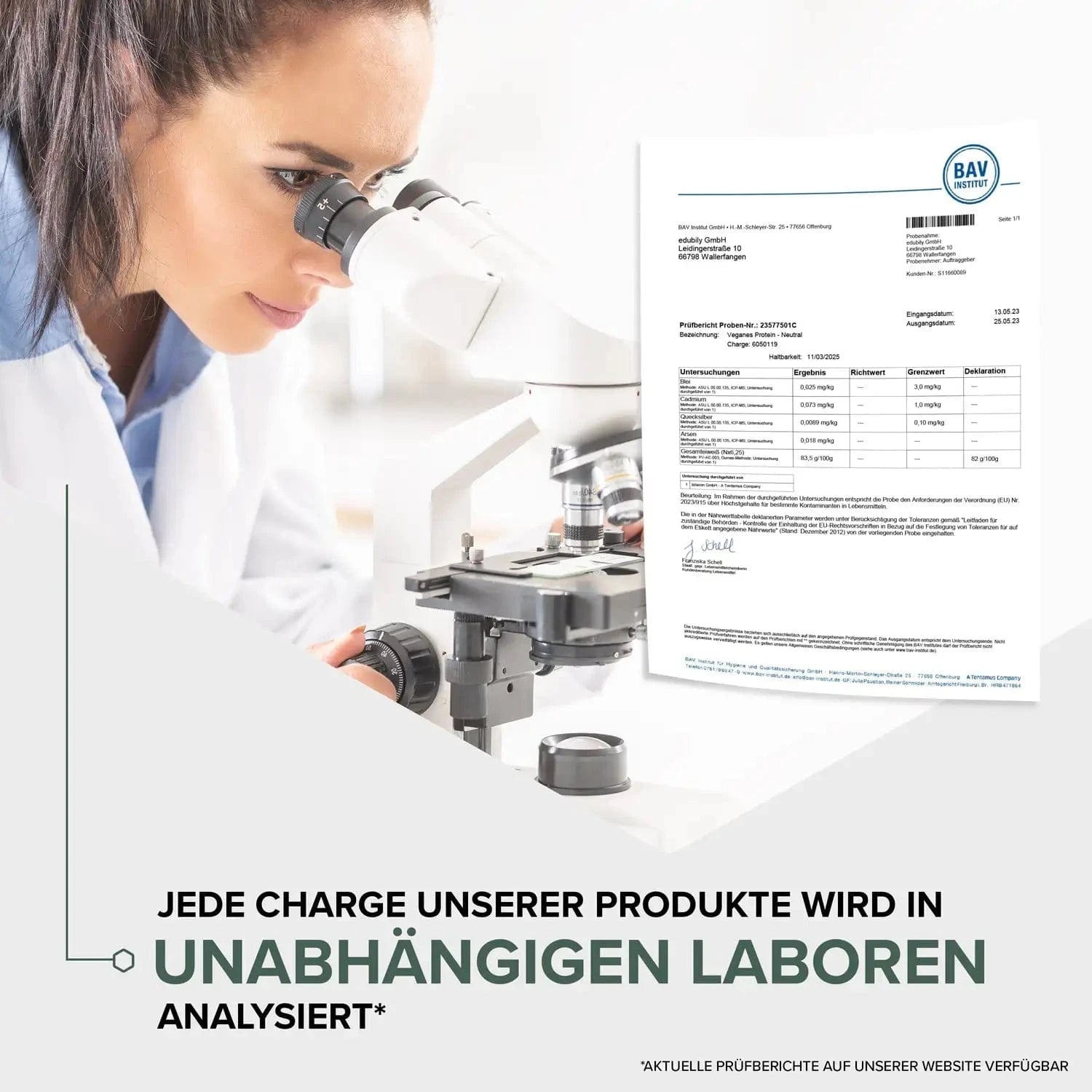 Edubily legt grossen Wert darauf, Produkte auf wissenschaftlich fundierter Basis zu entwickeln und herzustellen. Ihre Produktion erfolgt bei erfahrenen Partnern in Deutschland und Österreich, die regelmässig unangekündigt kontrolliert werden und nach IFS Food sowie HACCP zertifiziert sind. Damit erfüllt Edubily strenge Hygiene- und Sicherheitsanforderungen. Ausserdem werden alle Produkte nochmals in unabhängigen Laboren auf Faktoren wie Schwermetalle, Nährstoffgehalte und mögliche Verunreinigungen überprüft. Edubily verfolgt dabei das Ziel, nicht einfach beliebige Nahrungsergänzungsmittel anzubieten, sondern sichere sowie effektive, die durch durchdachte Rezepturen und ständige Weiterentwicklung der Gesundheit und dem Wohlbefinden entgegen kommen. So können Fitness-Athleten und gesundheitsbewusste Menschen sicher sein, ein hochwertiges und verantwortungsbewusst konzipiertes Produkt zu erhalten.