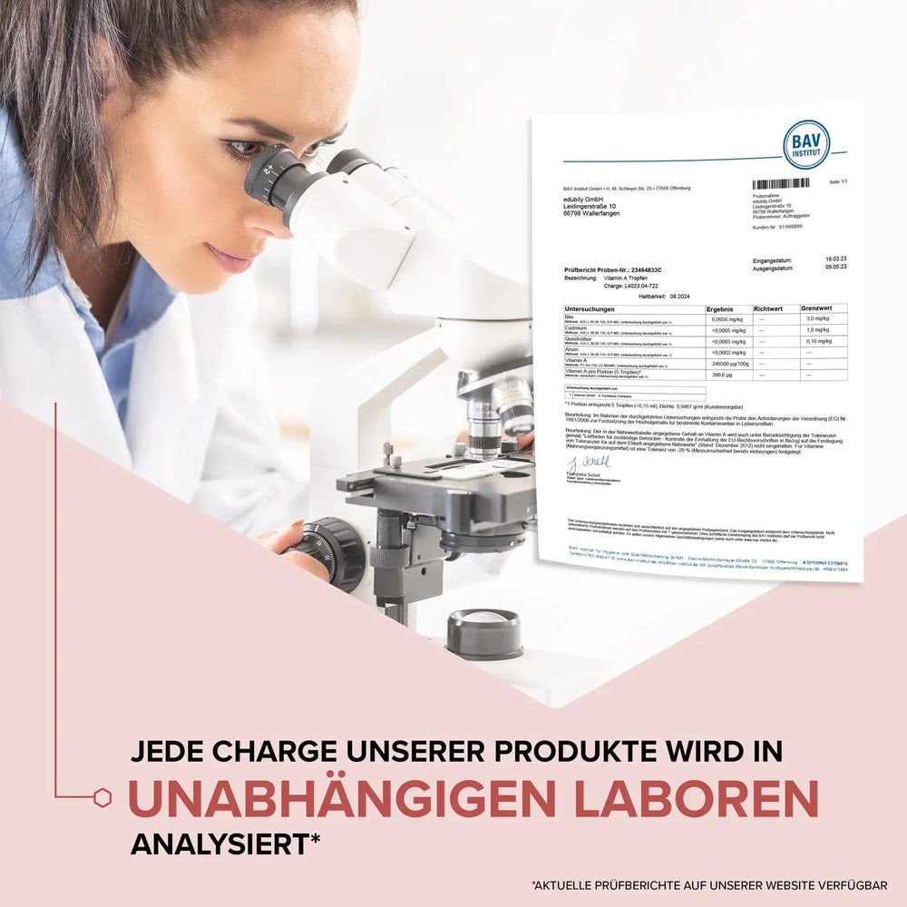 Edubily bietet dir Vitamin A sowohl in Kapselform als auch als flüssige Tropfen. Beide liefern 2.000 I.E. Vitamin A pro Portion (bei fünf Tropfen), das entspricht 600 µg (75 % NRV).