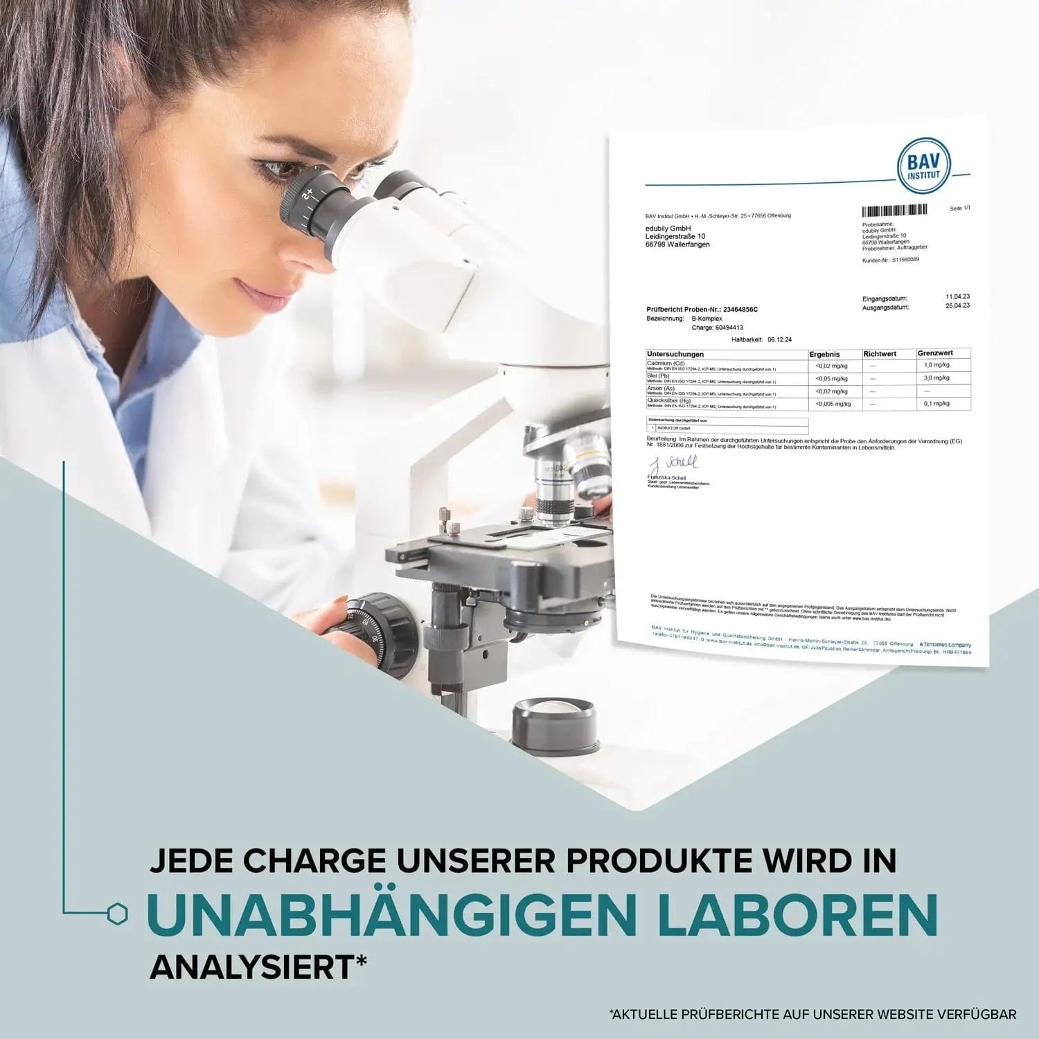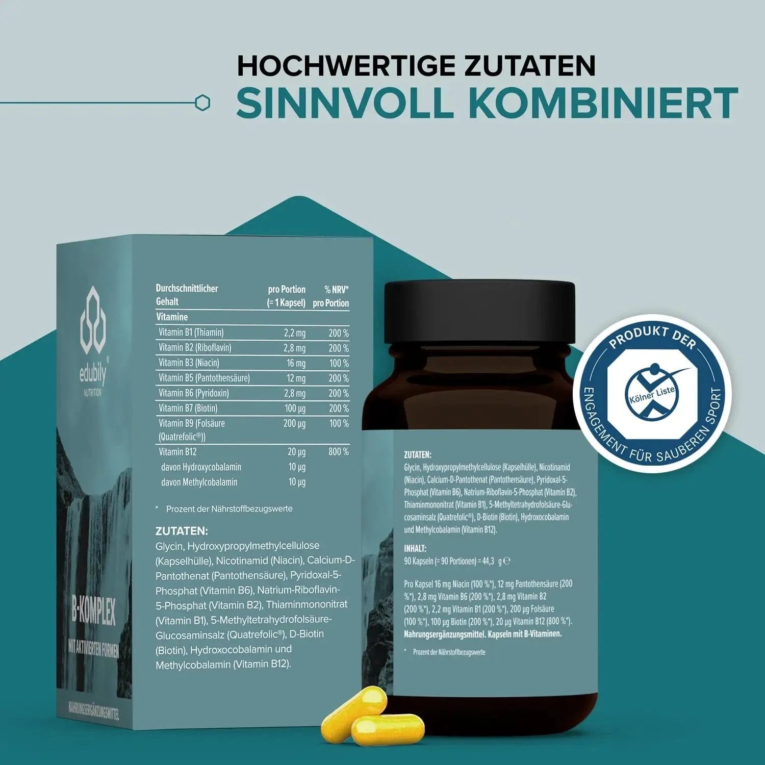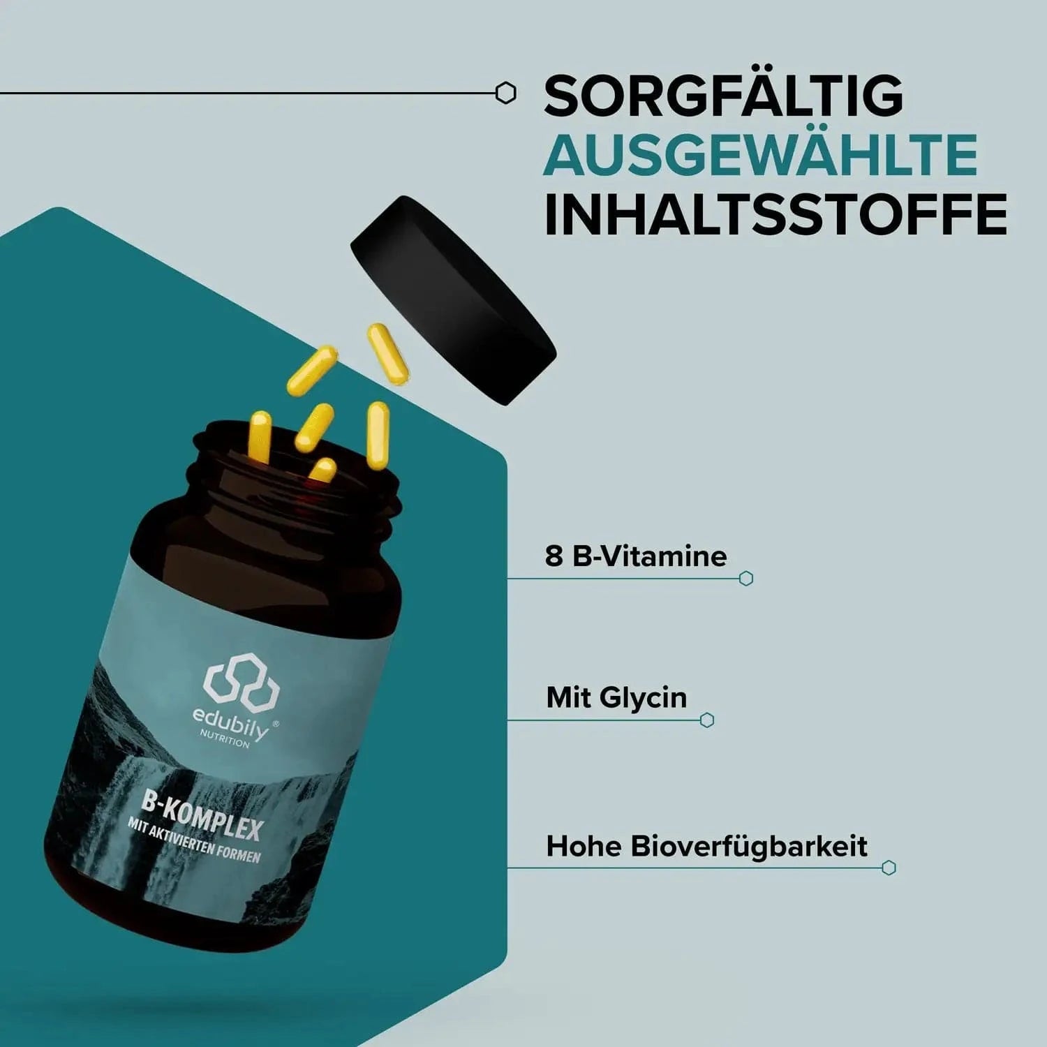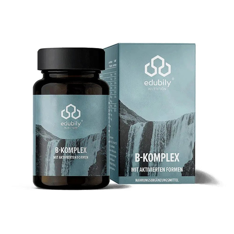 Der Edubily Vitamin B-Komplex bietet eine abgestimmte Mischung aus acht hochwertigen B-Vitaminen, die in ihrer aktivierten und bioverfügbaren Form vorliegen. Edubily setzt beispielsweise auf die bereits aktivierte Form von Vitamin B6 (Vitamin-B6-Phosphat), die stoffwechselaktive 5-Methyltetrahydrofolsäure (Methylfolat) sowie zwei bioaktive Vitamin B12-Varianten. Ergänzend dazu enthält das Präparat Glycin, das ebenfalls eine bedeutende Rolle im 1-Carbon-Stoffwechsel übernimmt.