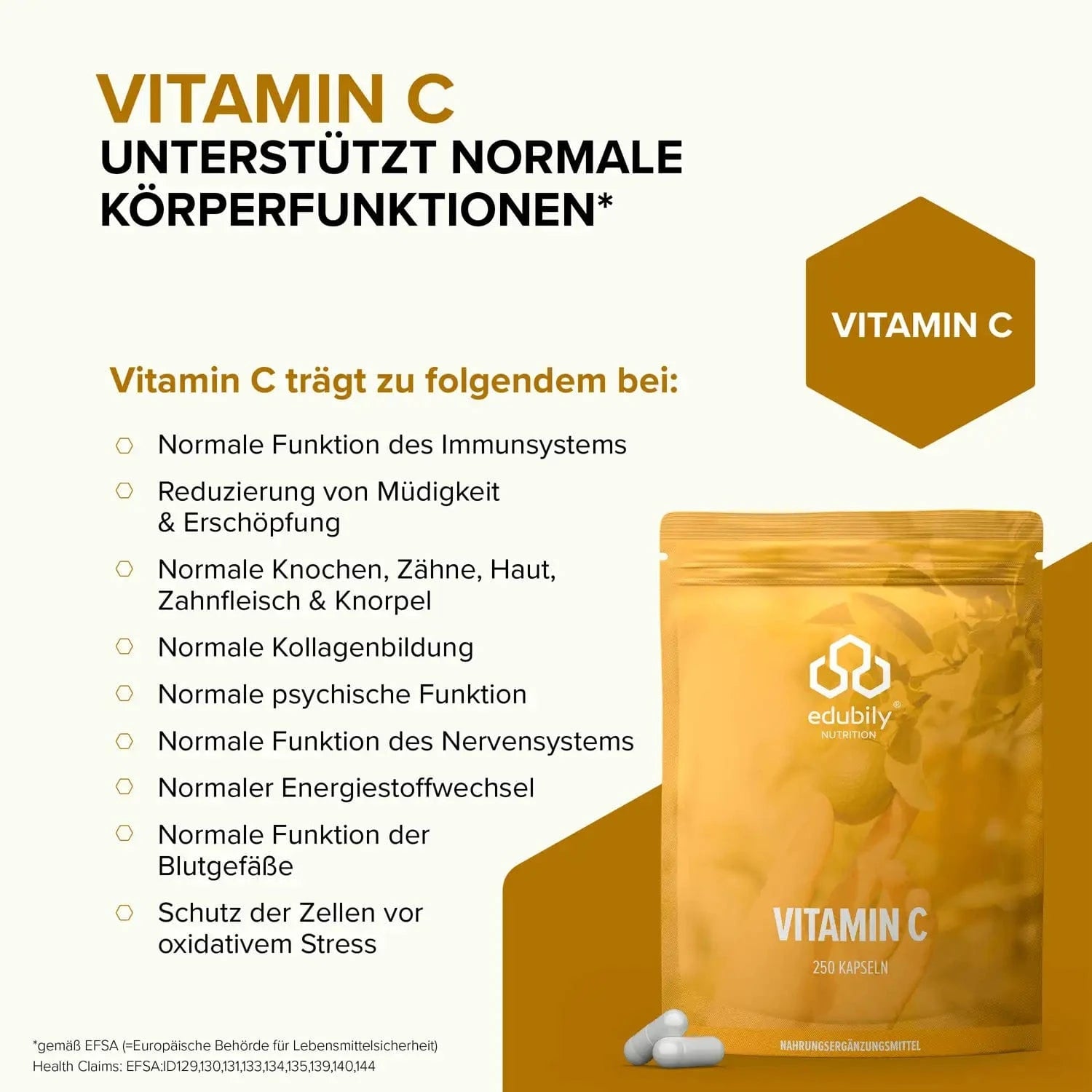 Vitamin C trägt zur normalen Funktion des Immunsystems und des Energiestoffwechsels bei, hilft Müdigkeit und Erschöpfung zu verringern, unterstützt die normale Funktion des Nervensystems und verbessert die Aufnahme von Eisen aus der Nahrung. Darüber hinaus leistet es einen Beitrag zur normalen Kollagenbildung – wichtig für die Erhaltung normaler Haut, Blutgefässe, Knochen, Knorpel und Zahnfleisch.