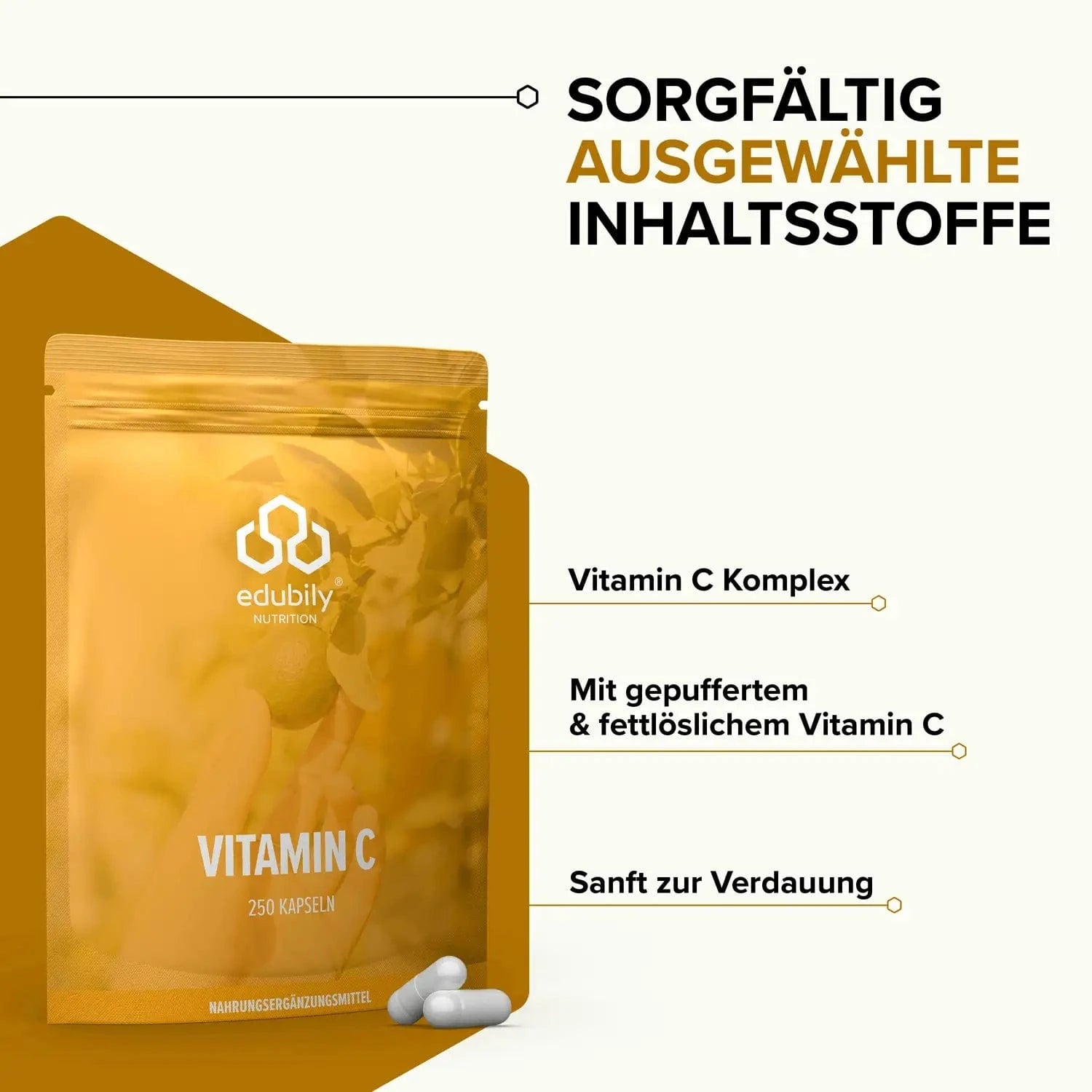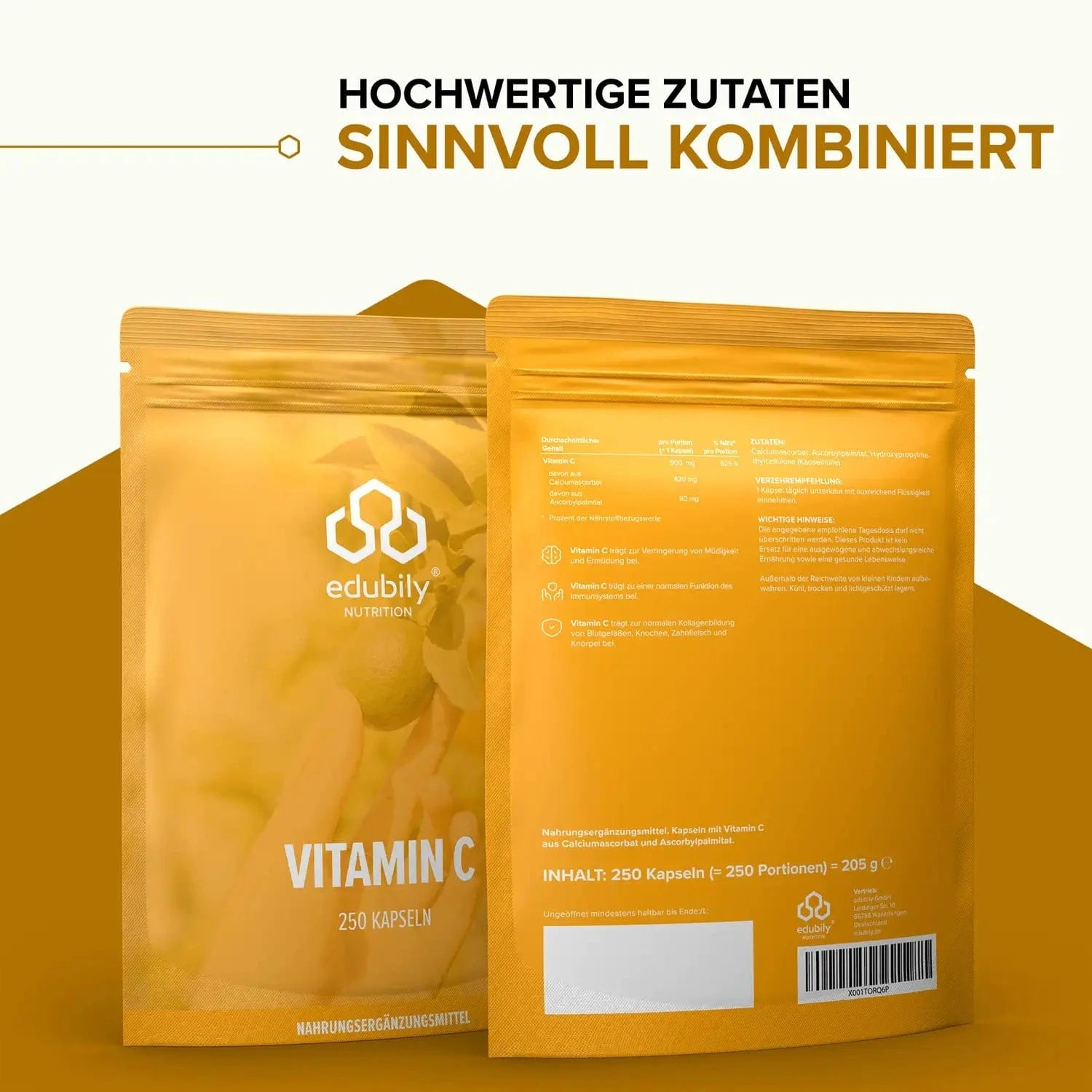 Jede Kapsel liefert 500 mg Vitamin C in optimaler Zusammensetzung. Die Vitamin C Kapseln von Edubily enthalten eine Kombination aus Calciumascorbat („gepuffertes Vitamin C“) und Ascorbylpalmitat („fettlösliches Vitamin C“). Beide Formen gelten als gut verträglich. Ascorbylpalmitat ist fettlöslich und kann sich in Membranen einlagern – dadurch ergibt sich eine andere Verteilung im Körper im Vergleich zu wasserlöslichem Vitamin C.