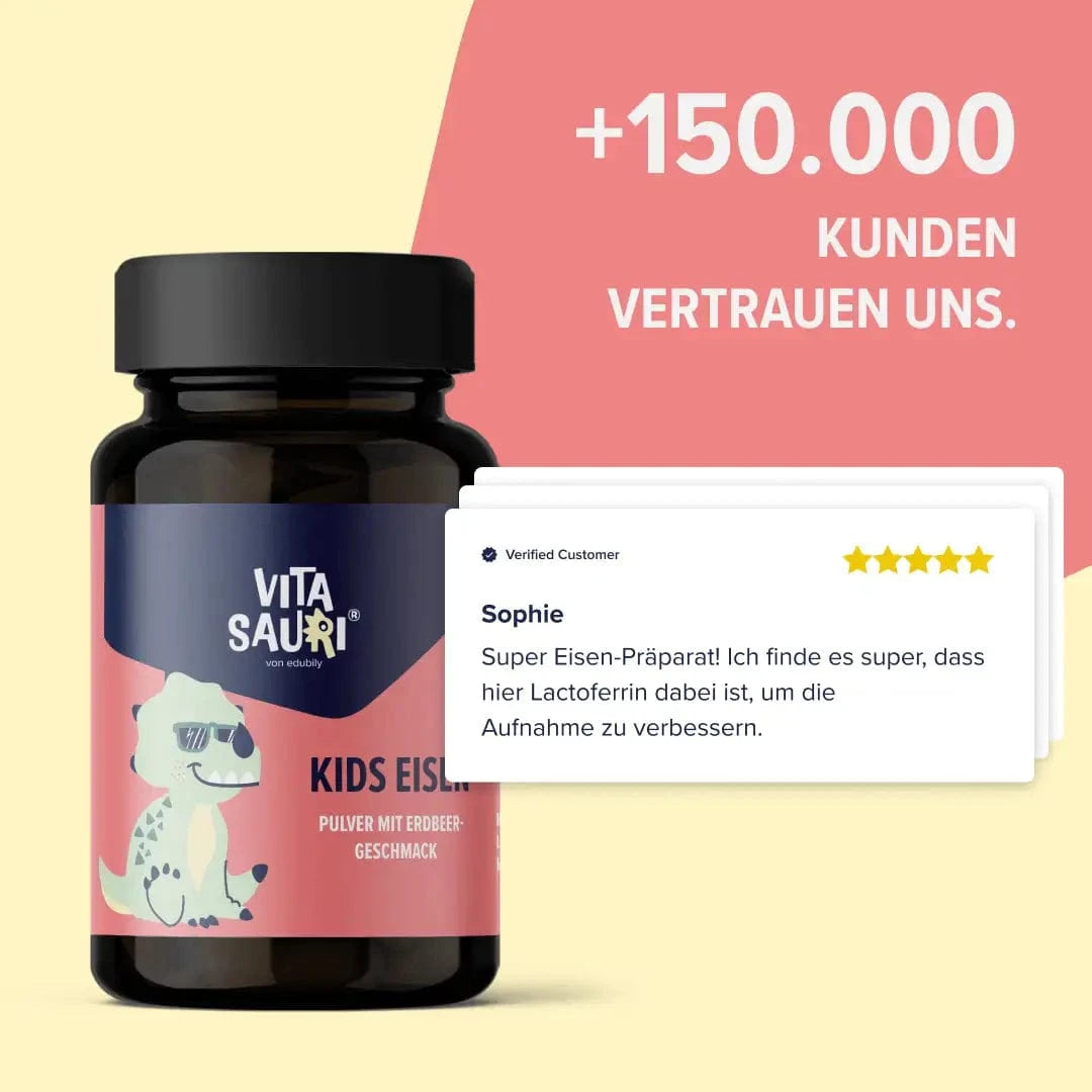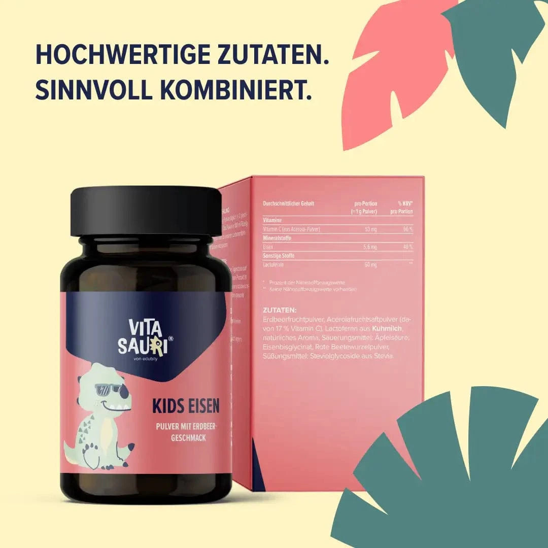 Eisen ist essenziell für die kindliche Entwicklung – doch nicht jedes Eisenpräparat ist gut verträglich. Vitasauri® Kids Eisen setzt auf Eisenbisglycinat, Lactoferrin und Vitamin C für eine optimale Bioverfügbarkeit ohne Magen-Darm-Beschwerden.