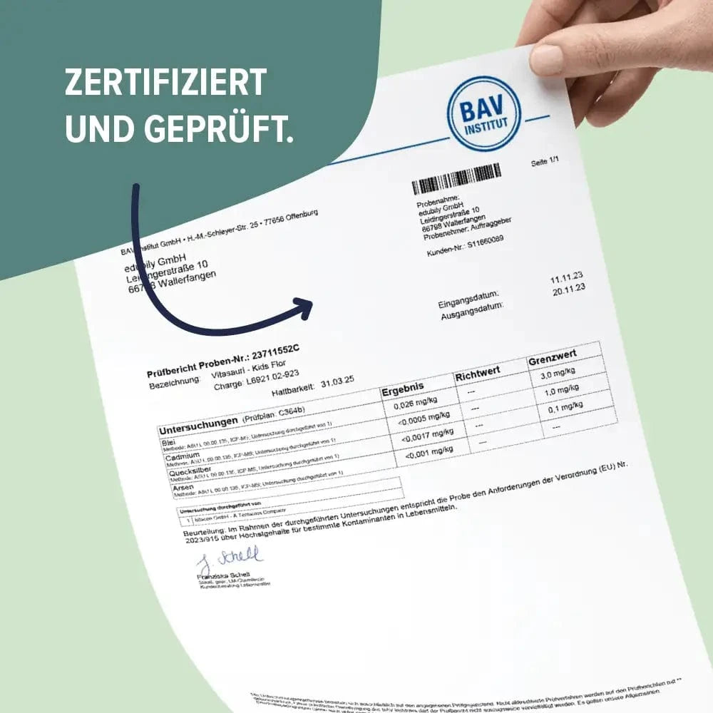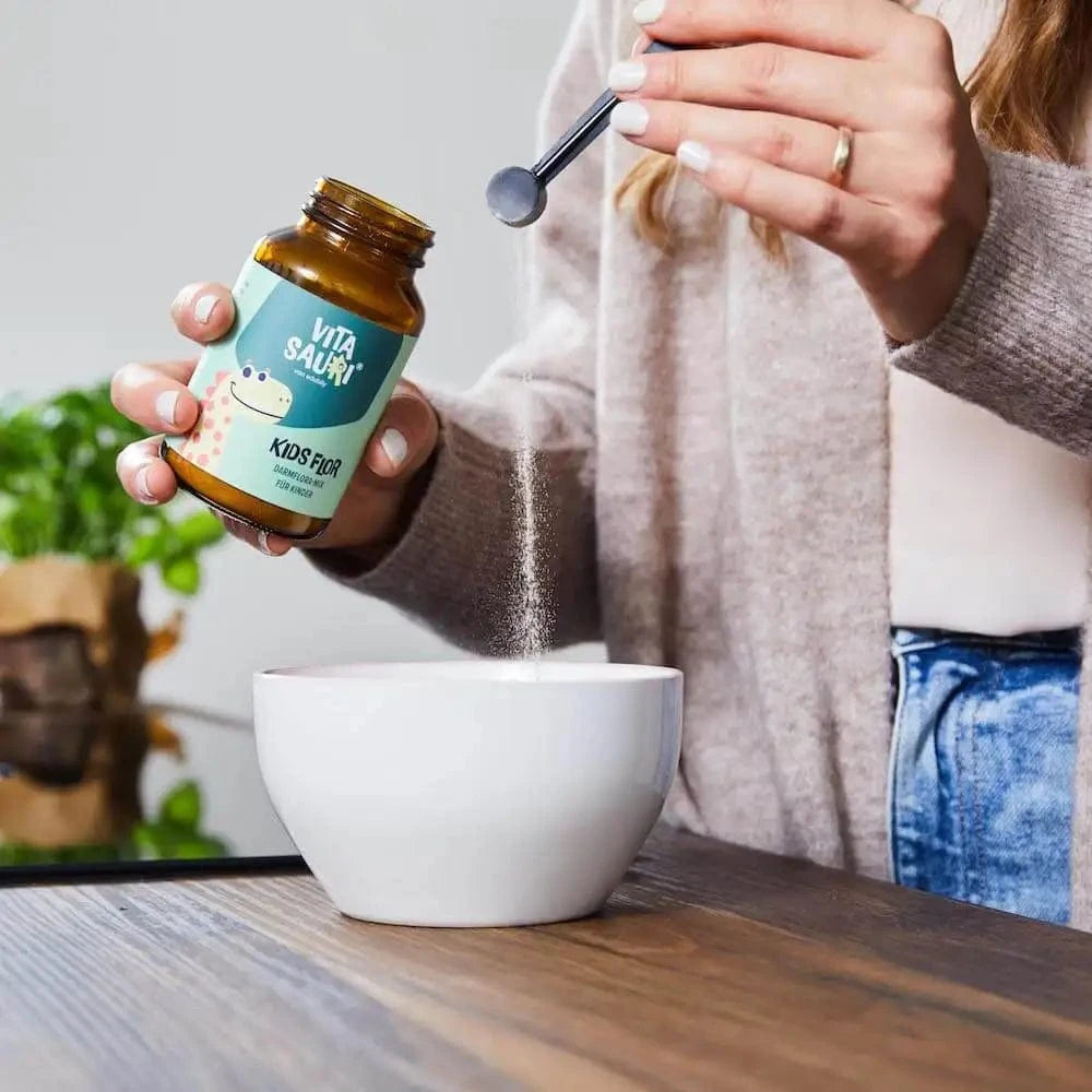 Der neutrale Geschmack von Kids Flor ermöglicht eine mühelose Integration in den Alltag deines Kindes. Einfach in Speisen oder Getränke einrühren – ohne dass dein Kind es bemerkt. So wird die tägliche Einnahme kinderleicht!