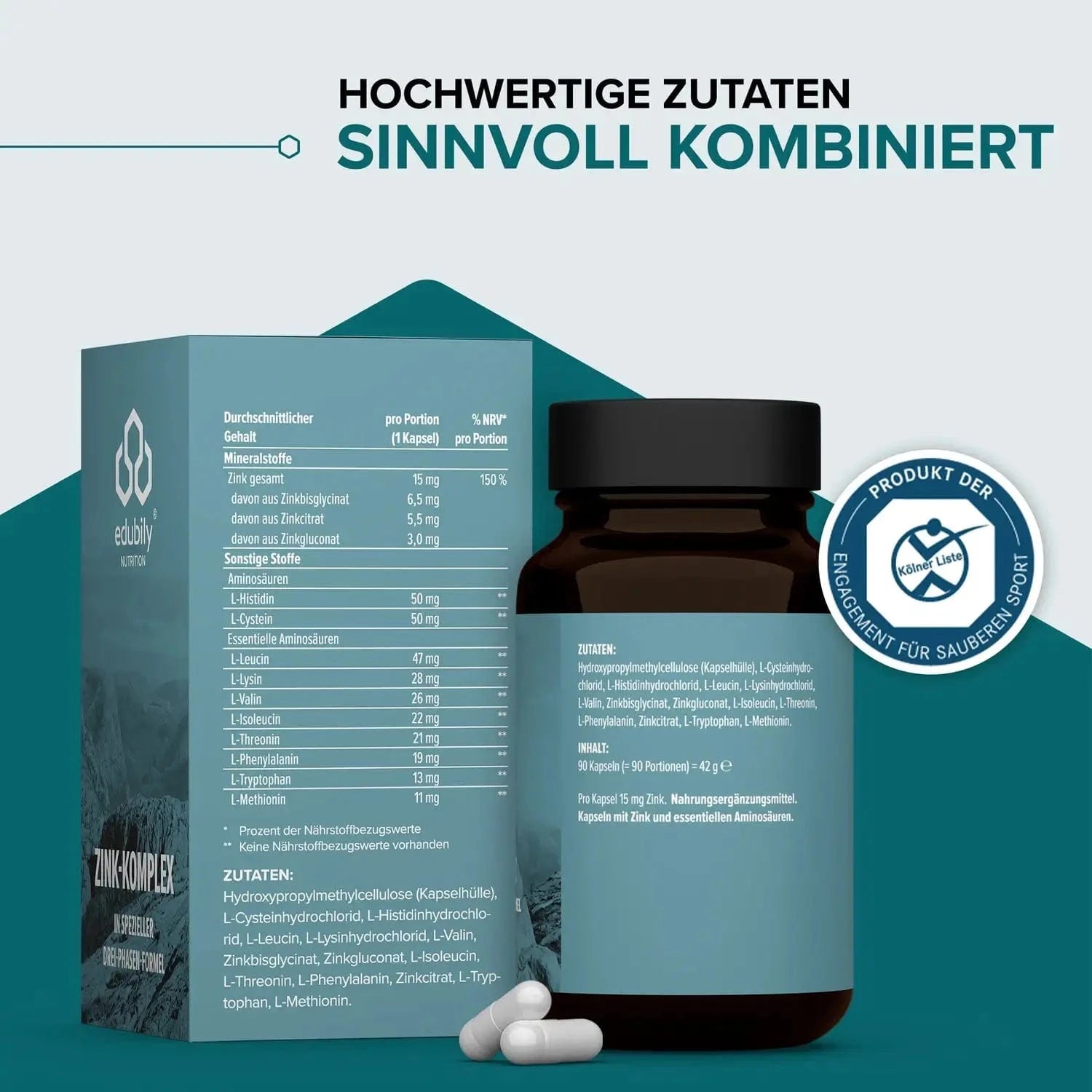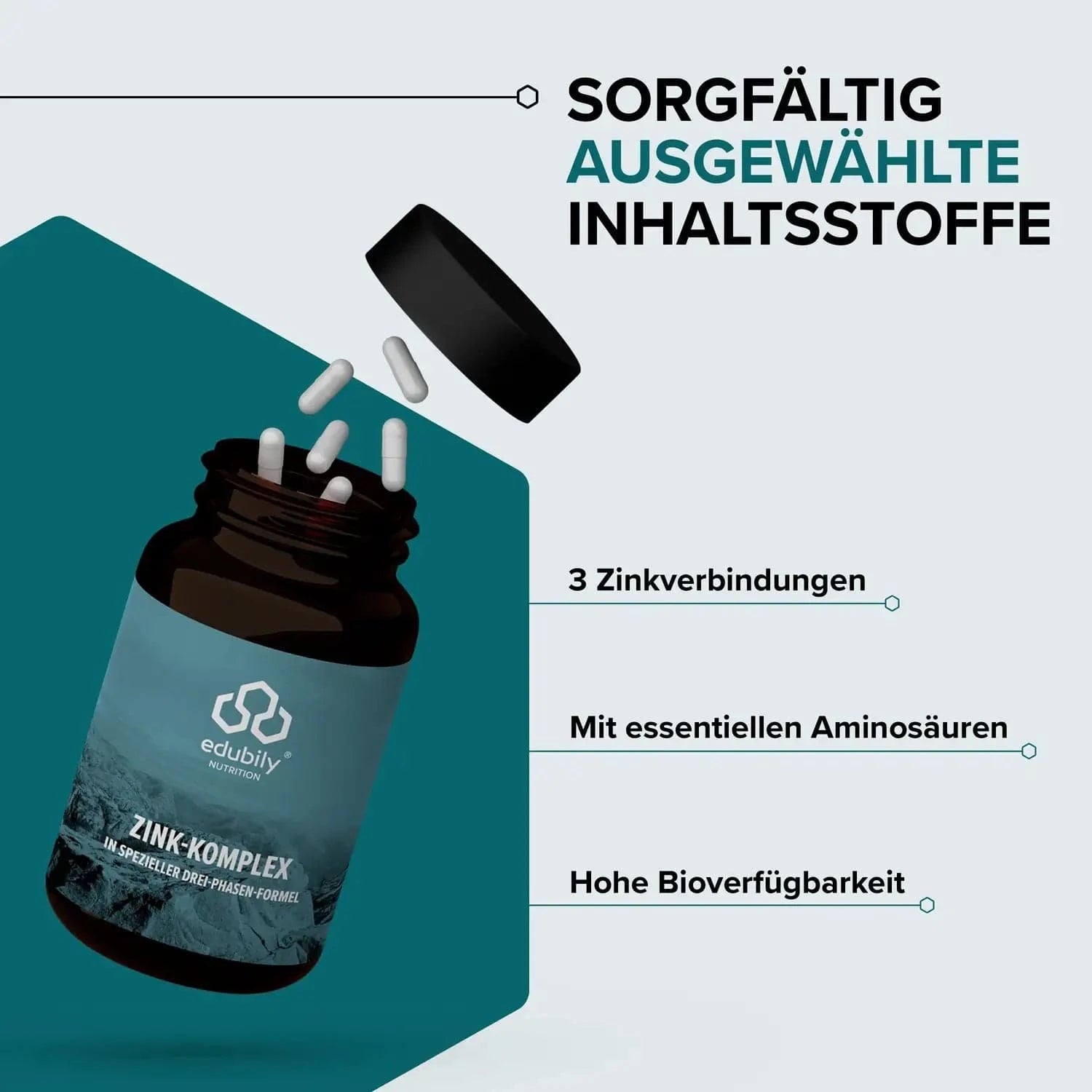 Relevant bei der Zinkzufuhr ist, neben der Zufuhrmenge, auch in welcher Form Zink dem Körper zur Verfügung steht und wie es aufgenommen wird. Der Edubily Zink Komplex basiert auf einem durchdachten Drei-Phasen-Modell, das drei Zinkverbindungen (Zinkglycinat, -citrat und -gluconat) mit unterschiedlichen Aufnahmewegen kombiniert und durch essentielle Aminosäuren ergänzt wird.